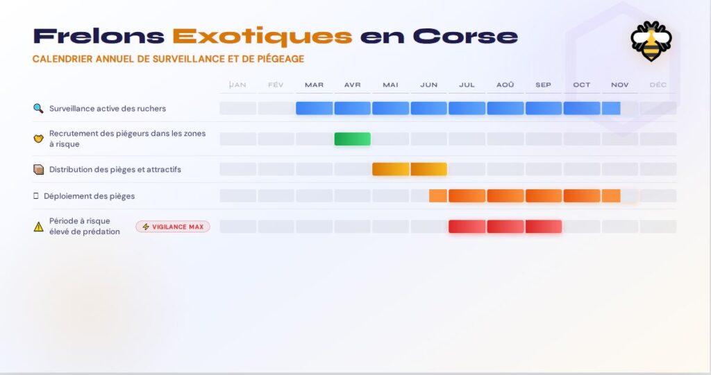 Les abeilles reprennent progressivement leur activité, et les potentielles fondatrices de frelons exotiques (notamment de frelon asiatique à pattes jaunes et de frelon oriental) sortent d’hivernation. Cette période marque donc la reprise de la surveillance active sur les ruchers.
